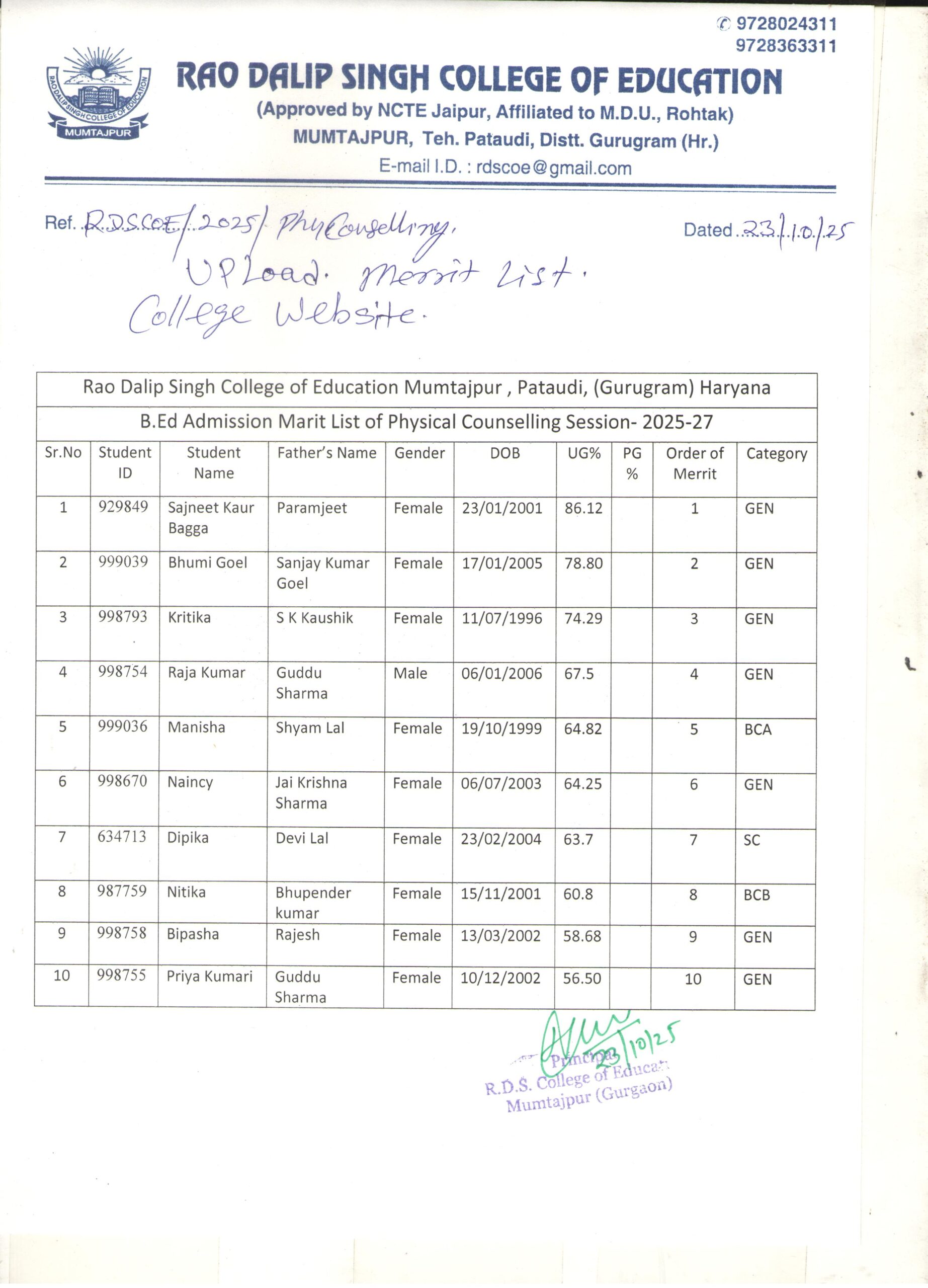 B.Ed Admission Merit List of Physical Counseling Session-2025-26